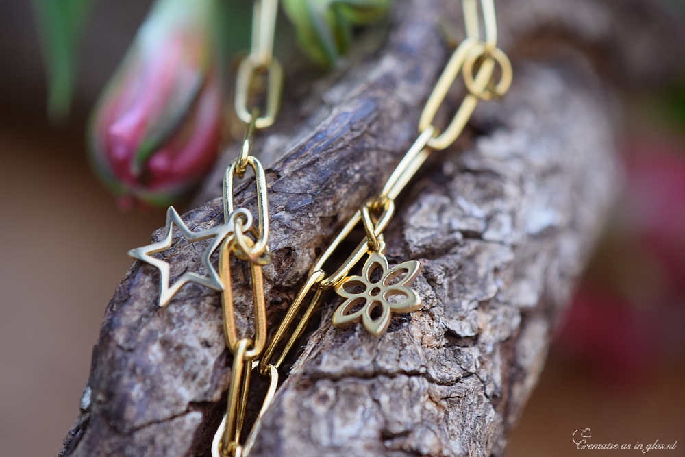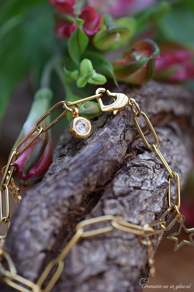 Urn bedelarmband voor dames van goudkleurig RVS met elegante platte schakels. Aan de armband hangt een handgemaakt glazen urnbolletje waarin crematie-as op ambachtelijke wijze wordt versmolten. De armband sluit met een hartvormige karabijnsluiting en bevat vijf symbolische bedeltjes: twee steretjes, twee bloemen en een helder kristalbedeltje bij de sluiting.